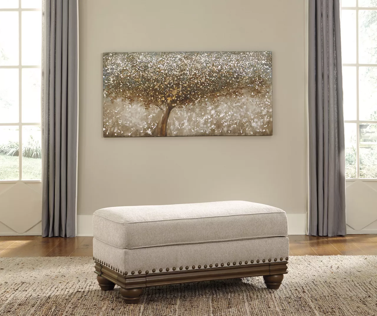True classic character comes to life in this ottoman. Warm brown exposed frame with bun feet is beautifully traditional. The lovely detailing carries itself through the herringbone weave in the soft upholstery. Its neutral tone lets you accessorize with any color, while the vintage-inspired jumbo nailhead trim graces the design all around.